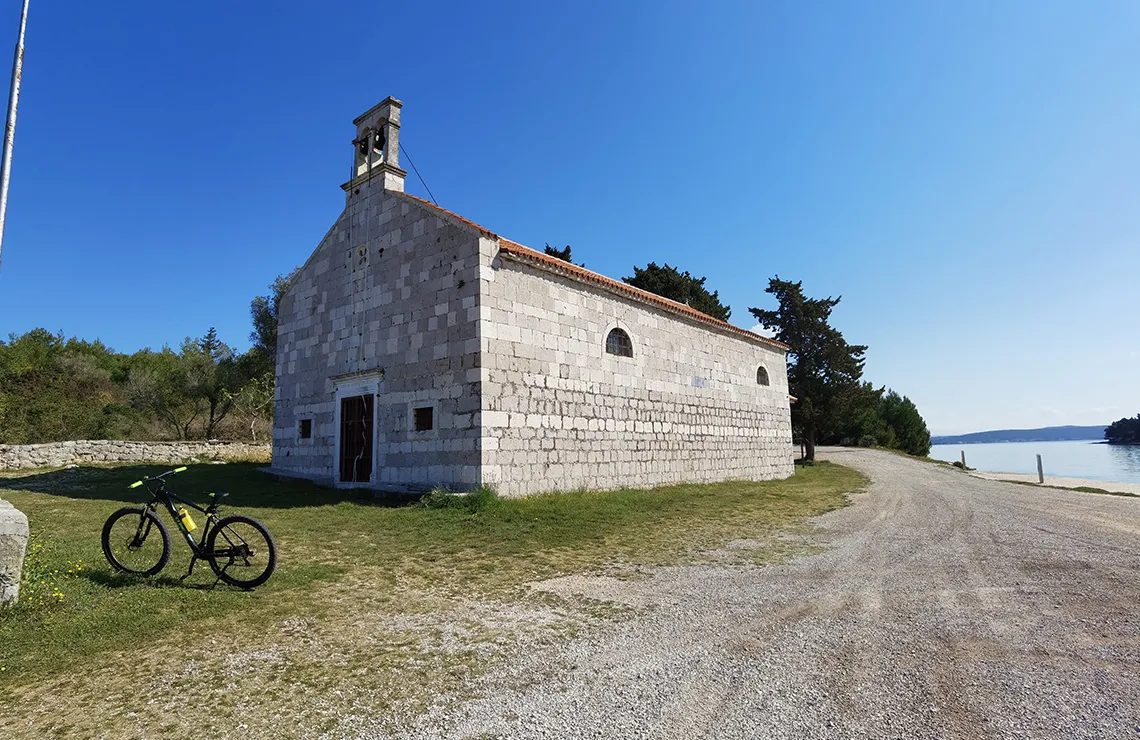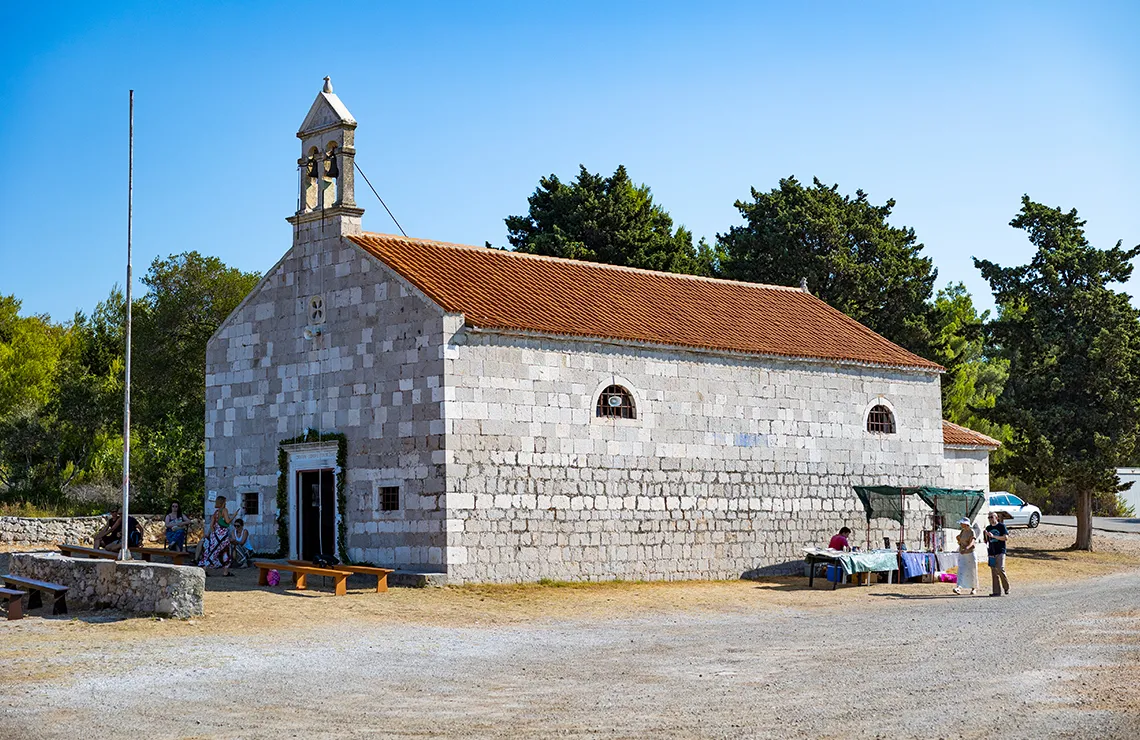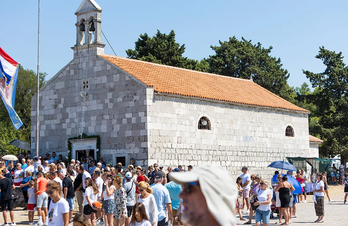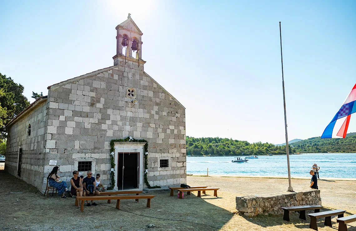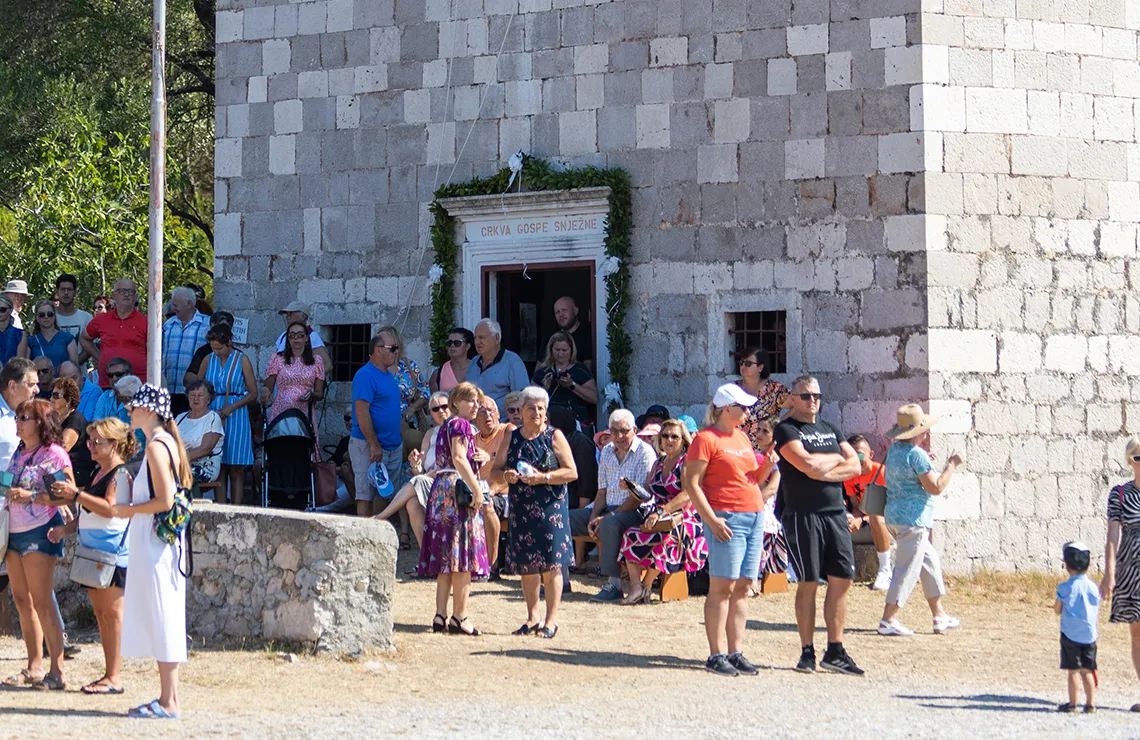 Die Kirche befindet sich in der Meerenge von Ždrelac zwischen den Inseln Ugljan und Pašman. Die Feier „Unserer Lieben Frau vom Schnee“ wird seit 1514 am 5. August gefeiert. Der Innenraum der Kirche mit dem Hauptaltar umfasst vier Marmorsäulen und ein Sanktuarium. Die Kirche hat insgesamt fünf Altäre; der Hauptaltar ist der Schutzpatronin der Kirche „Unserer Lieben Frau vom Schnee“ gewidmet und die anderen vier sind der Geburt der Heiligen Jungfrau Maria, der Heiligen Assunta, dem Heiligen Andreas und dem Heiligen Nikolaus gewidmet. Die Kirche spiegelt mit ihren Merkmalen den Barockstil des 17. Jahrhunderts wider und stellt ein wertvolles Kulturdenkmal in dieser Gegend dar. Deswegen wurde sie 1982 durch einen Beschluss der Kommission des Regionalen Instituts für den Schutz von Kulturdenkmälern in Split unter staatlichen Schutz gestellt.